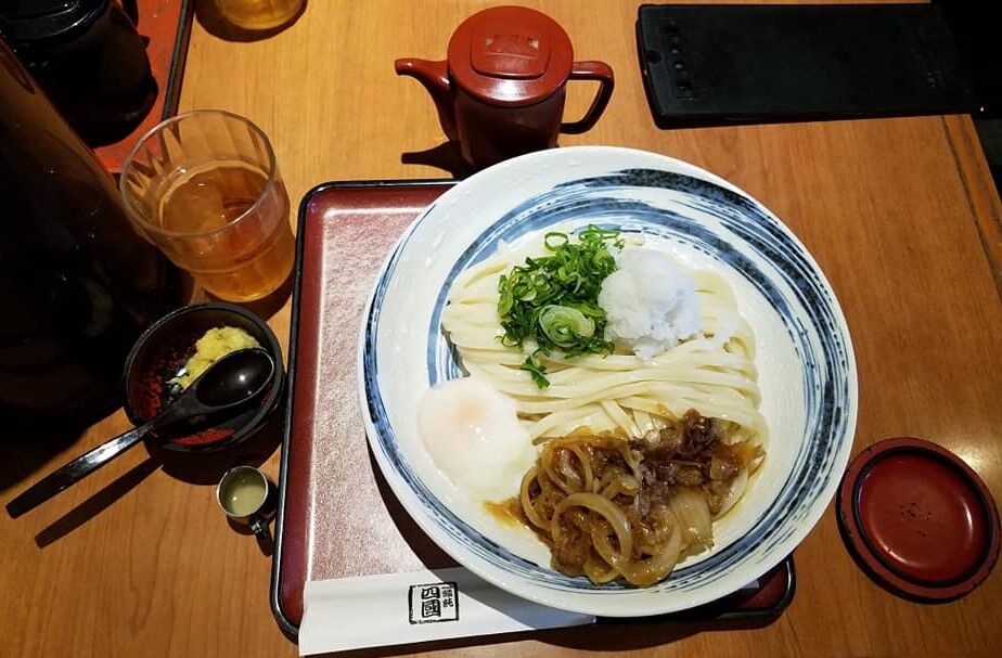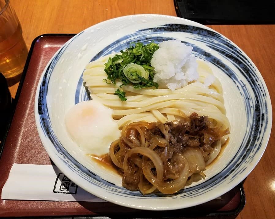 具材は、白髪ネギ、青ネギ、温泉たまご、牛肉が入ってカレーパウダー?がふられています。