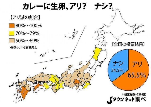 改めて全国の調査結果を見てみても、カレーに生卵はアリという人が65.5%(1443票)と半数を超え、多数派であることが分かった。