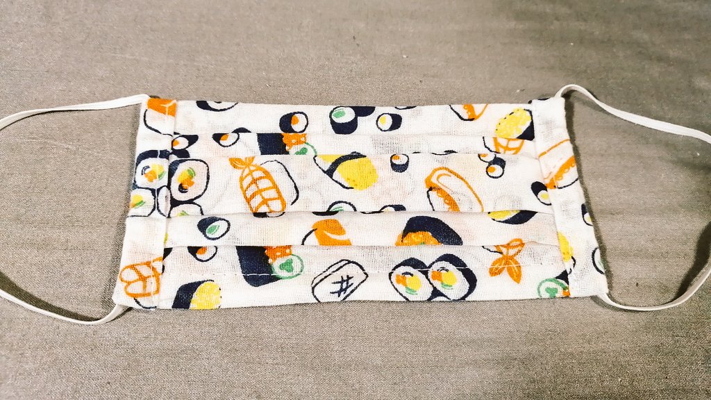 @mu_lovechocolat寿司柄マスク😷100均で売ってる、手ぬぐいが丁度よいー。ガーゼより肌触りはシャリッとするけど。